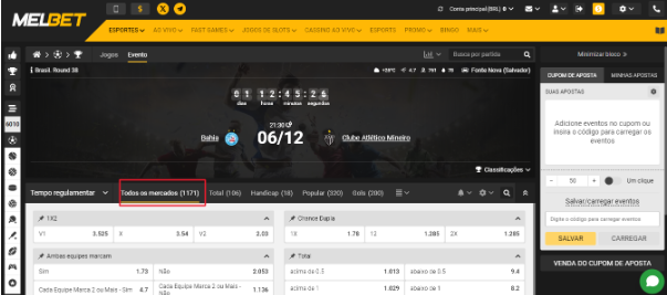 Para isso, basta clicar em cima do evento e a tela com os mercados de apostas aparecerá. Note que a aposta simples feita no jogo entre Atlético MG e Bahia segue incluída em nosso cupom de aposta: